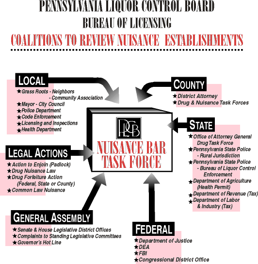 Yesterday someone brought to our attention that there are establishments with liquor licenses that are violating the terms of their licenses. Pennsylvania’s Liquor Control Board (PLCB) is the agency that issues licenses to dispense to retail establishments and to private clubs. While the PLCB is not the enforcement agency (the State Police are), “The Board, however, is charged by statute with authority to issue licenses, to make regulations, and to protect the safety, peace, health and welfare of the Commonwealth [47 P.S. § 1-104(a)]. The Nuisance Bar Program was established within this scope of Board authority.”