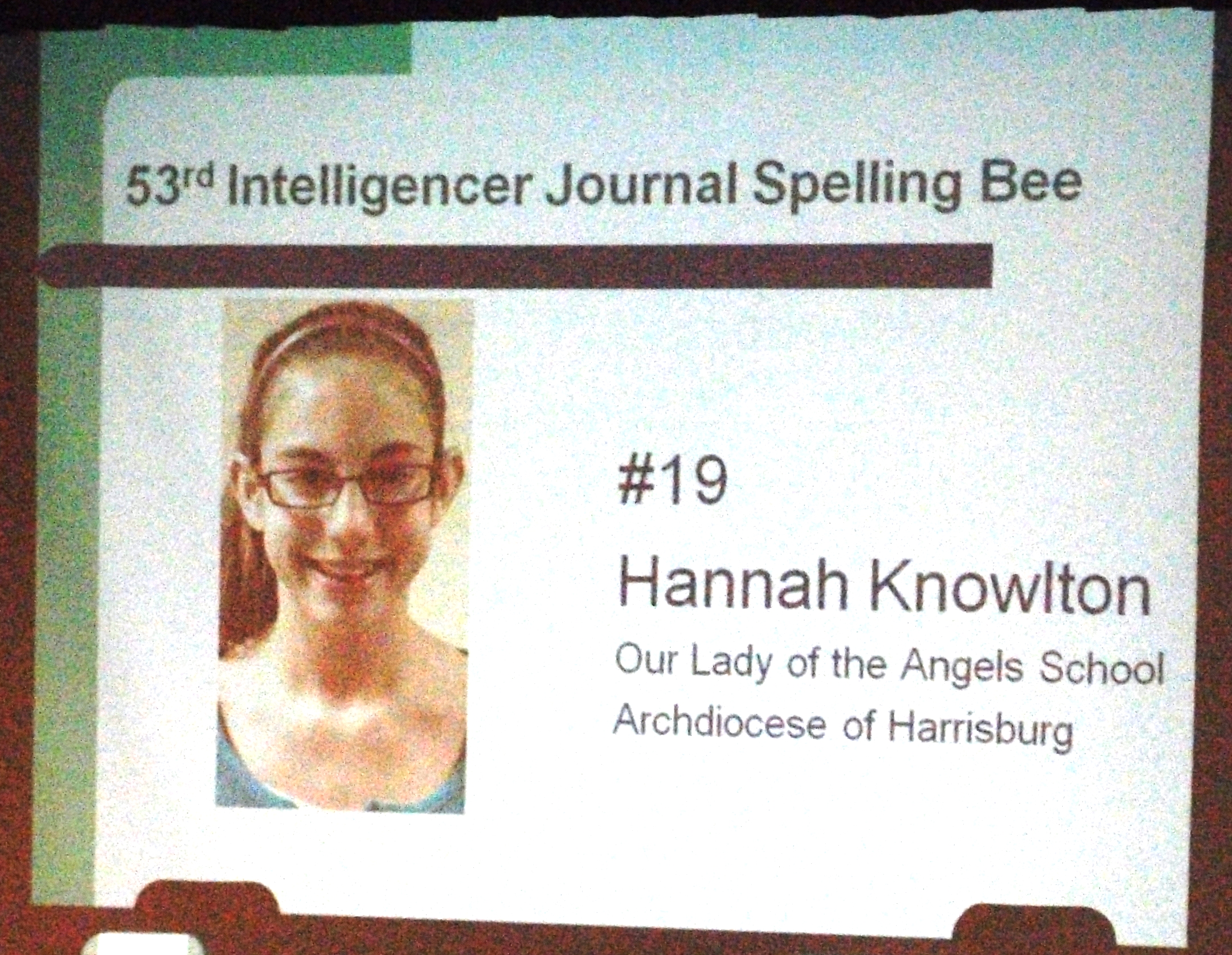 We will wait to attach tomorrow’s Lancaster Newspapers’ article about the Spelling Bee (now attached; watch the video, too). But we wanted to give you the first report about Hannah’s journey. So, please allow us the opportunity to congratulate Hannah and thank her supportive family and friends, her classmates and teachers at Our Lady of the Angels school and everyone in Columbia for supporting her tonight.