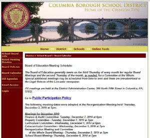 “This information is posted at the Columbia School District Website (below): “Special additional meetings may be scheduled from time to time and these are pre-advertised in the Legal Notices of the Lancaster newspaper. All meetings are held at the District Administration Center, 200 North Fifth Street in Columbia, PA, 17512.”