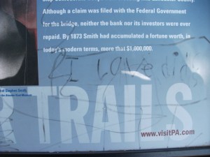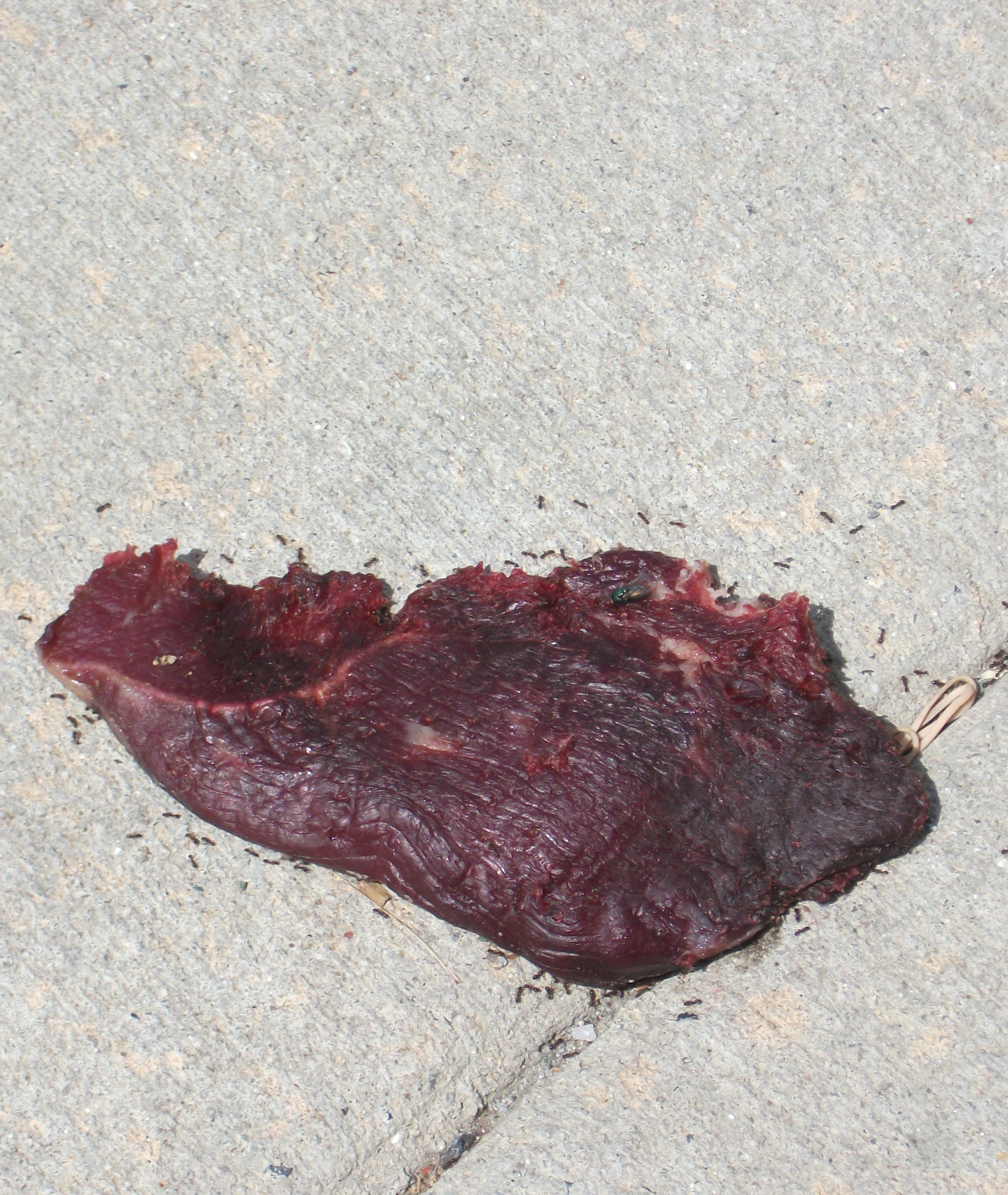 Finally, we happened across this (?) while walking on Fourth Street between Locust and the Post Office. Kind of reminds us of the Tony Bennett classic, “I left my heart in San Francisco.” How about I left my flank steak (or other body part) in Columbia?