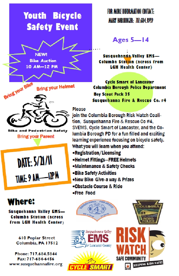 May 15, 2011May 12, 2011 17512 Columbia Saturday, May 21: the annual Youth Bicycle Safety Event! Share this: Click to share on Facebook (Opens in new window) Facebook Click to share on X (Opens in new window) X Like Loading... Related