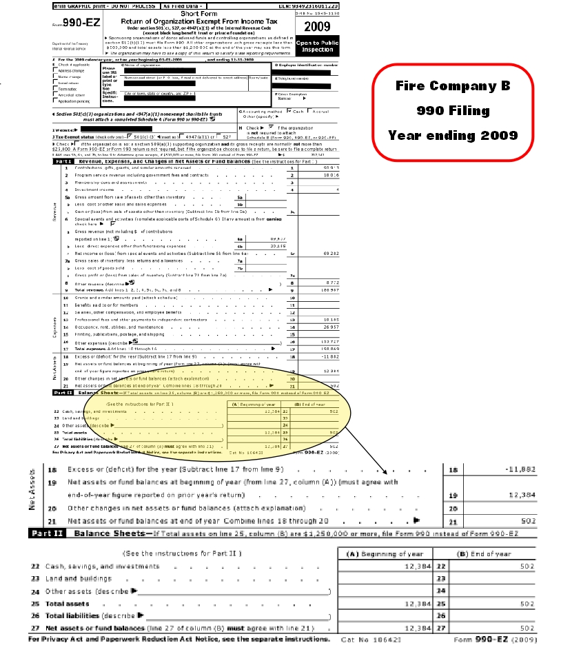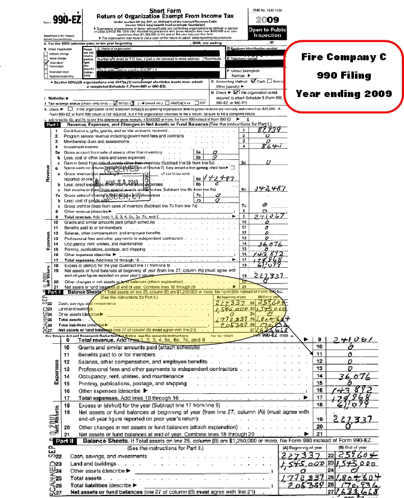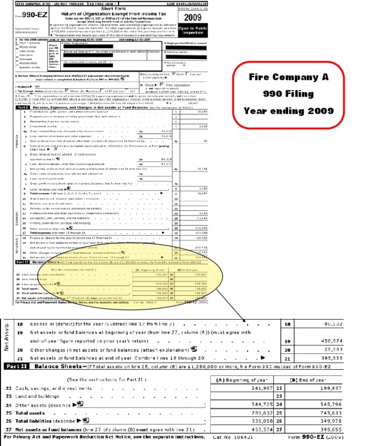 The IRS Form 990 is an annual reporting return that certain federally tax-exempt organizations must file with the IRS. It provides information on the filing organization’s mission, programs, and finances. Here are the first pages of 2009 990’s for three area fire companies.