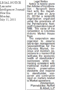 - LEGAL NOTICE … This Legal Notice in today’s Lancaster Intelligencer Journal/New Era is a requirement under Pennsylvania law; it provides public notice that the Columbia Historic Market House Trust has been registered as a non-profit organization with the Commonwealth of Pennsylvania (https://columbianewsandviews.com/wp-content/uploads/2011/07/pa-business-entity-registration-columbia-historic-market-house-trust.pdf.)