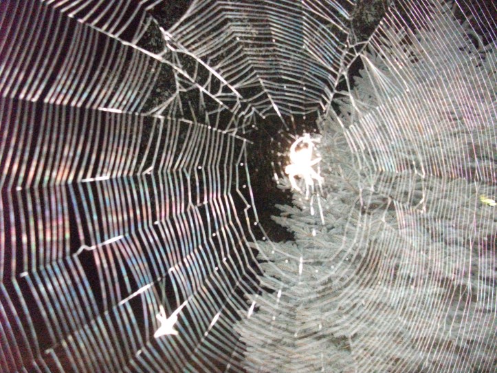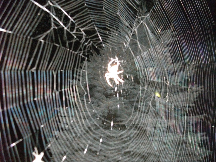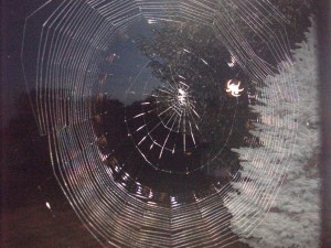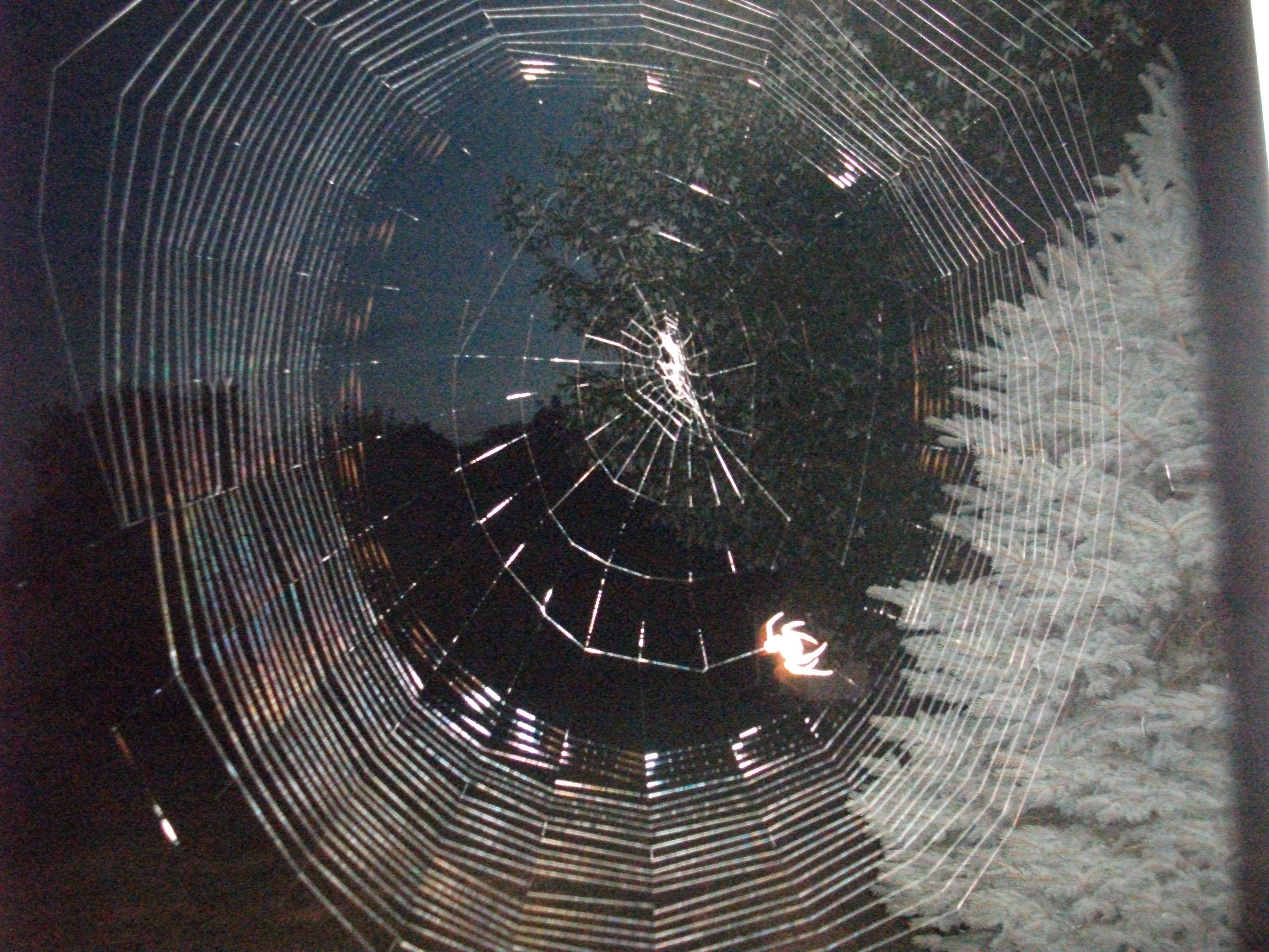 A few nights ago, we went outside around 11:00 and saw this amazing spider-architecture. The photos will not be National Geographic worthy – remember this is an amateur with a not-that-expensive digital camera. As we watched Mr. (Ms.) Spider for the next 15 or so minutes, we were fascinated by the incredible and exquisite nature of this web and his/her food gathering acumen.