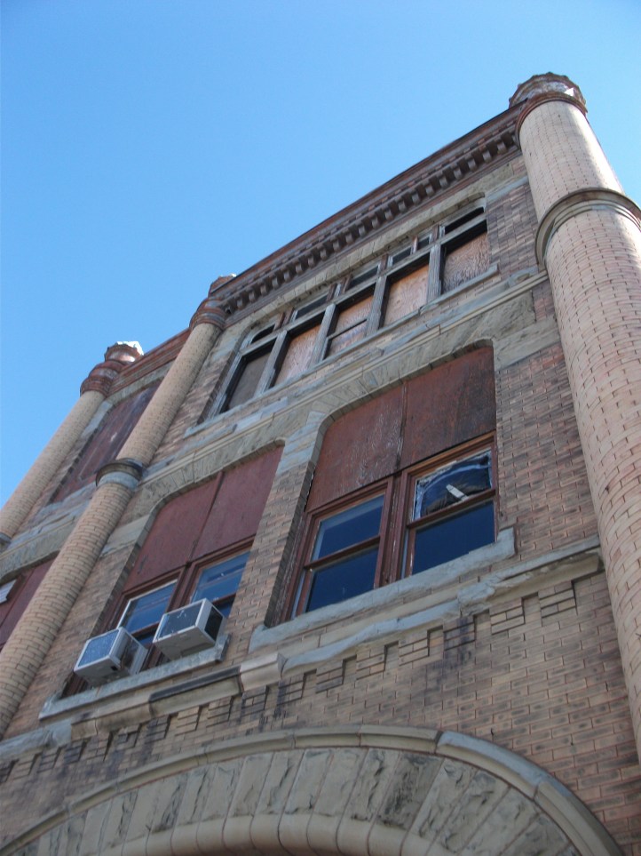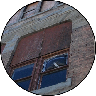 And we took this picture some days (maybe weeks) ago; wonder how a “premiere” landlord who is attracting a “high-end antiques shop” also has properties with broken out windows.