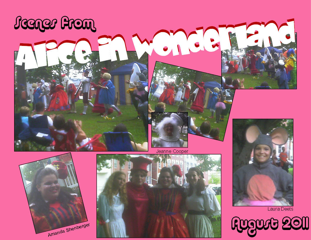 Dodo, played by Gabriella Veneziano; Lory, played by Faleisha Veneziano; Alice’s Sister, Gryphon, played by Megan Fehr; Mock Turtle played by  Tyler Garrison; Red Queen played by Jazz Preston; Duchess and Queen of Hearts played by Amanda Shenberger; Caterpillar, Humpty Dumpty played by Mitch Cooper; Fish Footman, Three of Hearts, played by KaBrinna Splain; Fish Footman played by Janette Musser; Frog Footman, Lily played by Jess Kuhns; Cook, Violet, played by Donna Manual; Cheshire Cat, Six of Hearts played by Kelsey Ulrich; Mad Hatter played by Sara Burke; March Hare played by Patrick Manuel; Dormouse played by Haley Lutz; Daisy, Lamb played by Krystal Fritz; Daisy, Monkey played by Darren Brandt; Knave of Hearts played by Phil Brandt; King of Hearts played by Dave Kreiser; White Queen played by Jeanne Cooper, and last but not least, Eagle, Six of Hearts, and the Red Knight, played by Kyle Fritz.