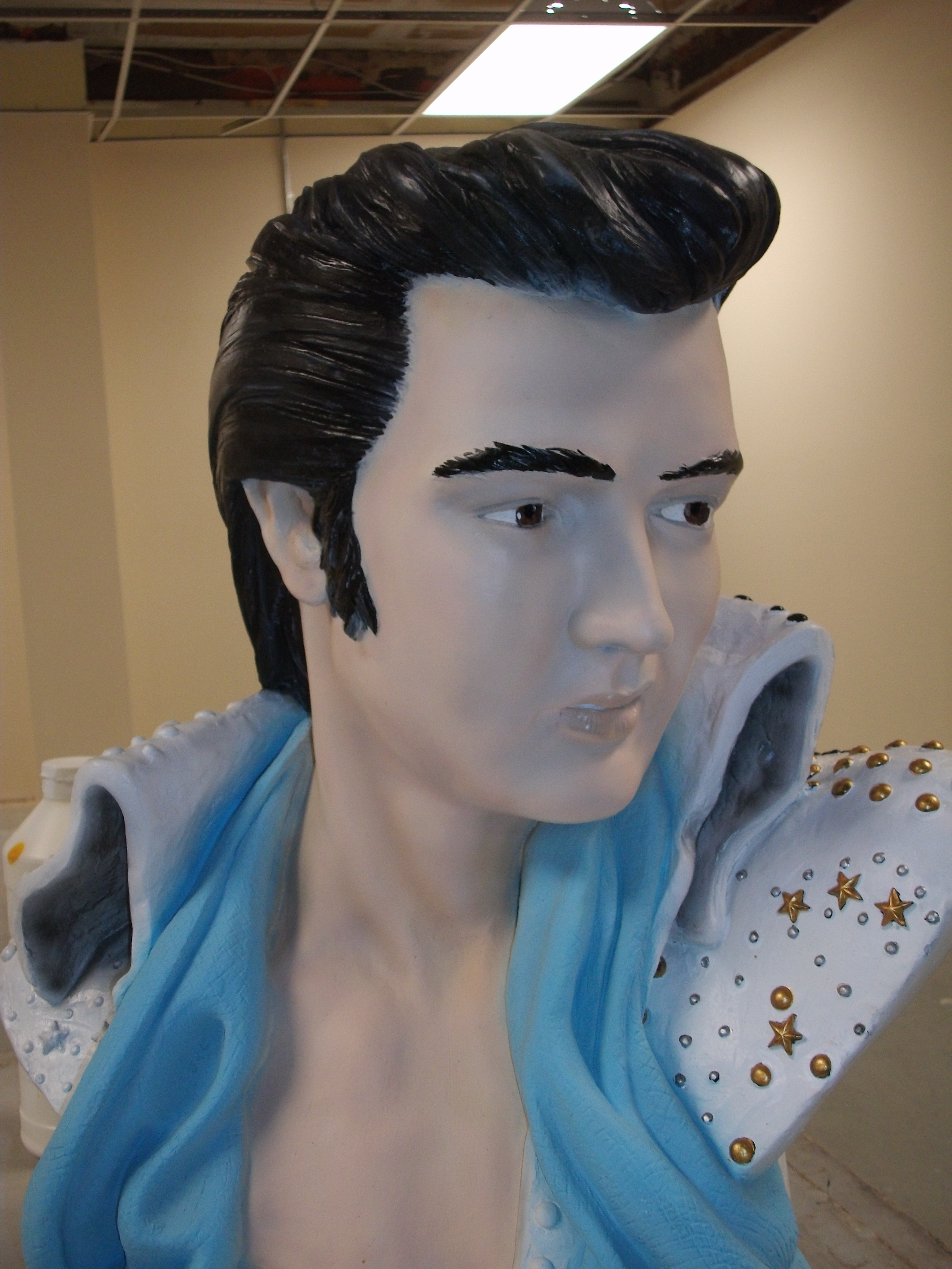 We were out-of-town when “Elvis” performed at the Hotel Locust on August 6 during the Grand Opening, but have heard that a big crowd was there. Lots of “new faces” and a good performance. The hotel houses this Elvis bust: