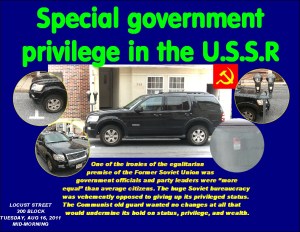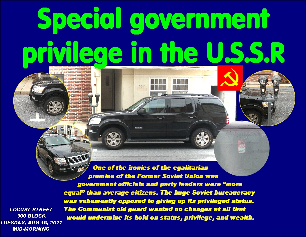 Walking up Locust Street yesterday after a breakfast at Hinkle’s, we chatted with a citizen who pointed to the SUV across the street. “That’s been there since yesterday,” said the citizen. I noted that it was occupying two parking spaces and would be ticketed when the meter enforcement person comes by. The citizen said it didn’t matter because it was a borough employee’s vehicle. Seems borough employees can stick that borough tag on their mirror and park at any parking meter any time they want without ponying up any coins. Heck, it seems they can park anywhere with abandon … one parking space or two … makes no difference.