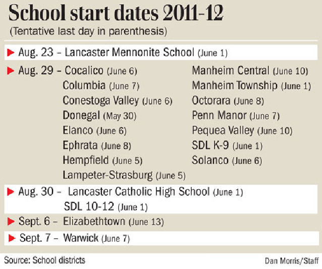 - School start dates in the county; Columbia’s start date is August 29. (Lancaster Intelligencer Journal/New Era)