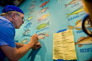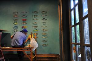 Burkhart was painting a variety of fish species on a wall that will serve as a reference point for visitors who will be able to search and identify similar fish paintings inside the restaurant and bowling alley.