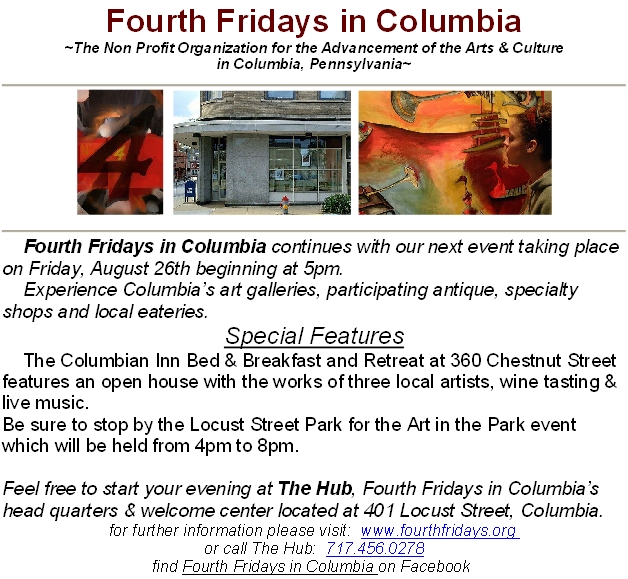 August 24, 2011August 23, 2011 17512 Columbia This Friday in Columbia … art happens! It’s time for Fourth Fridays in Columbia and Art in the Park. Share this: Click to share on Facebook (Opens in new window) Facebook Click to share on X (Opens in new window) X Like Loading... Related