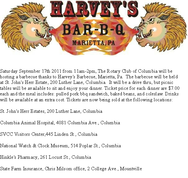 - Tomorrow is the Columbia Rotary Club Bar-B-Q at St. John’s Herr Estate. You can buy your tickets now.
