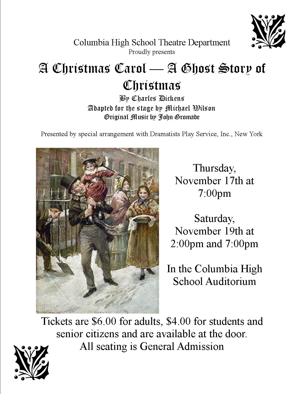 Christmas comes early this year as more than thirty-five students from the Columbia School District take the stage in “A Christmas Carol – A Ghost Story of Christmas”.  Charles Dicken’s classic life-affirming tale of redemption and transformation as adapted for the stage by Michael Wilson is at once eerie, funny, touching, and uplifting, and is sure to enchant both young and old alike.