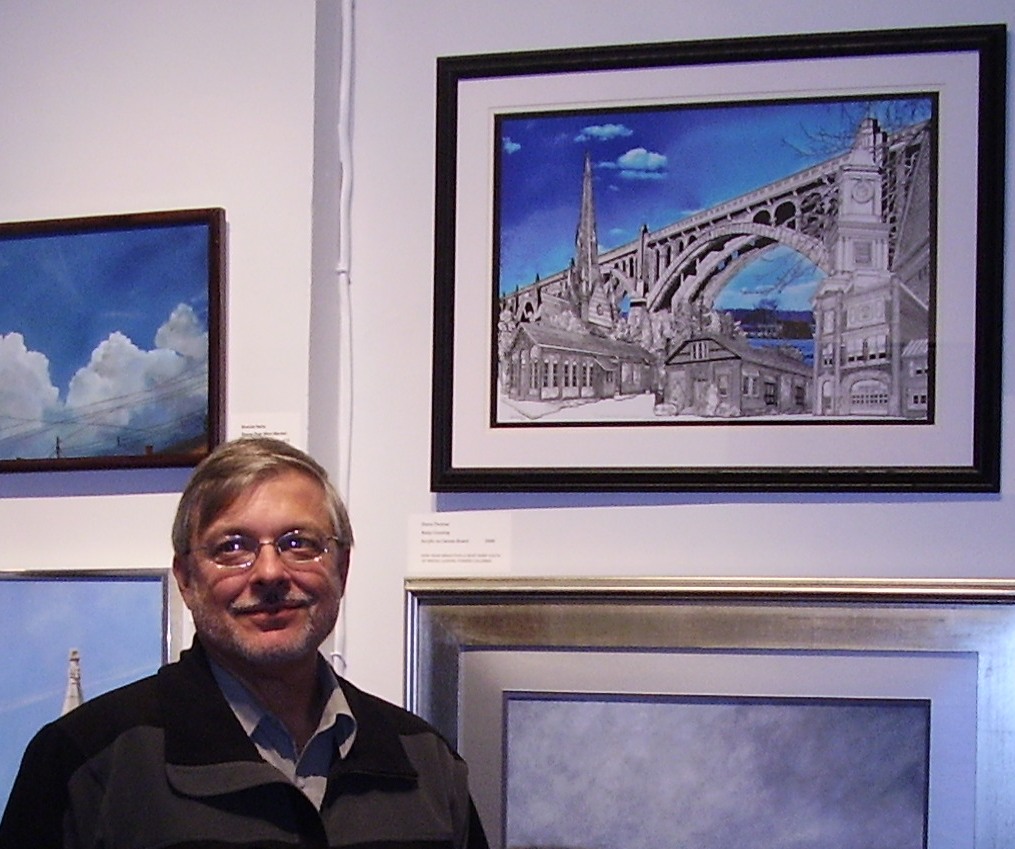 David Haneman of Marietta, who is active in the town’s community activities, hatched the idea for the rivertowns show with several others. Then he specially created detailed collage of the Wrightsville Bridge with local buildings included. His work hangs over a soft impressionist painting of the river and the bridge by Columbia artist Diana Thomas.