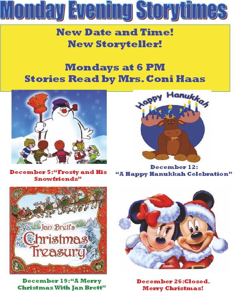 Due to low attendance on Saturday mornings, we are going to try moving our story time to Monday evenings at 6 PM. Storyteller will be Mrs. Coni Haas, a former teacher from York County. Mrs. Haas volunteers at our library every Monday afternoon, so some of you may already have met her! She will be visiting the Head Start classes with me in November, so that local children will get to know her. Coni loves reading aloud and is very much looking forward to meeting the children and sharing stories with them!