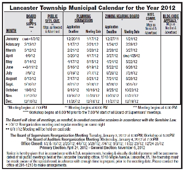 - At this time of the year, municipalities and jurisdictions publish their 2012 meeting calendars as LEGAL NOTICES as stipulated under Pennsylvania law. Notice the format that Lancaster Township selected for their calendar (and Warwick Township’s earlier notice) in today’s Lancaster Intelligencer Journal/New Era; it provides a convenient, easy-to-read reminder service for their residents.