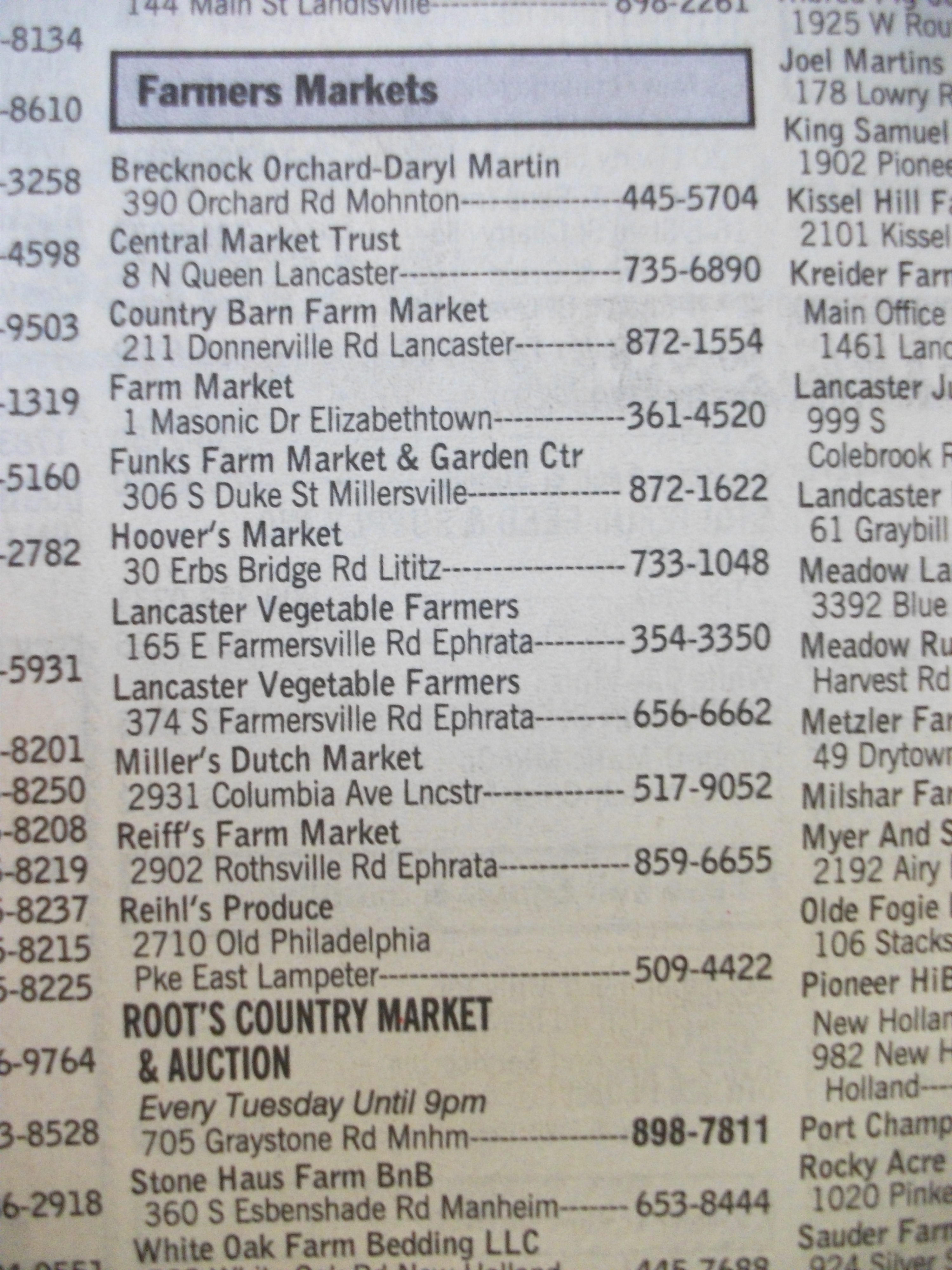 We looked for local FARMERS MARKETS in all three of the directories. Guess what, if you are trying to contact the Columbia Market House, you’re apt not to find that there is a farmer’s market in Columbia. You’ll find the Central Market Trust in Lancaster, Root’s Market and a bunch of other ones … but this year again, you WILL NOT FIND a listing for Columbia.