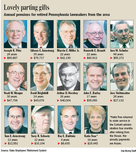“The findings, obtained through a Right-to-Know request with the State Employees’ Retirement System (SERS), show that gross annual annuities range from a high of $90,867.48 paid to former state Rep. Joe Pitts, who is now in Congress, to a low of $6,434.88, paid to former state Rep. Roy Baldwin, an engineer from Manheim Township.