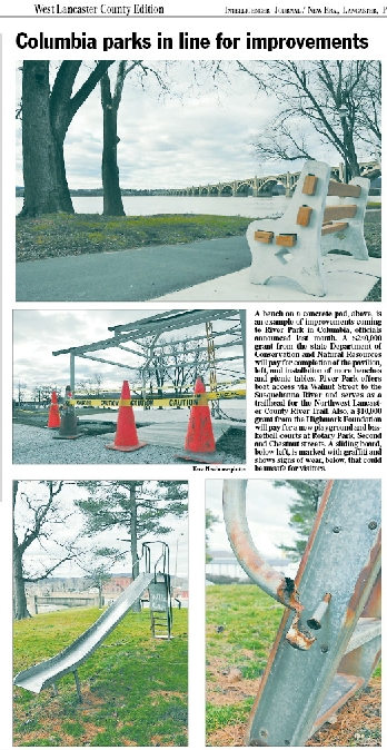 - Columbia Parks photos in today’s Lancaster Intelligencer Journal/New Era. The text in the clipping states, “A bench on a concrete pad, above is an example of improvements coming to River Park in Columbia, officials announced last month. A $250,000 grant from the state Department of Conservation and Natural Resources will pay for completion of the pavilion, left, and installation of more benches and picnic tables. River Park offers boat access via Walnut Street to the Susquehanna River and serves as the railhead for the Northwest Lancaster County River Trail. Also, a $10,000 grant from the Highmark Foundation will pay for a new playground and basketball courts at Rotary Park, Second and Chestnut Streets. A sliding board, below left, is marked with graffiti and shows signs of wear, below, that would be unsafe for visitors.”
