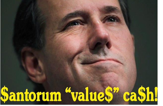 This opportuni$t who did not represent Pennsylvanians well when he was a $enator is catching some attention in the $earch for the next Republican candidate for president. The plastic $mile and $weater vest candidate moved to prominence in Iowa with his “family value$” palaver. But $cratch the $urface of this holy roller veneer and the true “$antorum value$” $pring forth: He’s out for the CA$h! He’s building his family’s dollar value!
