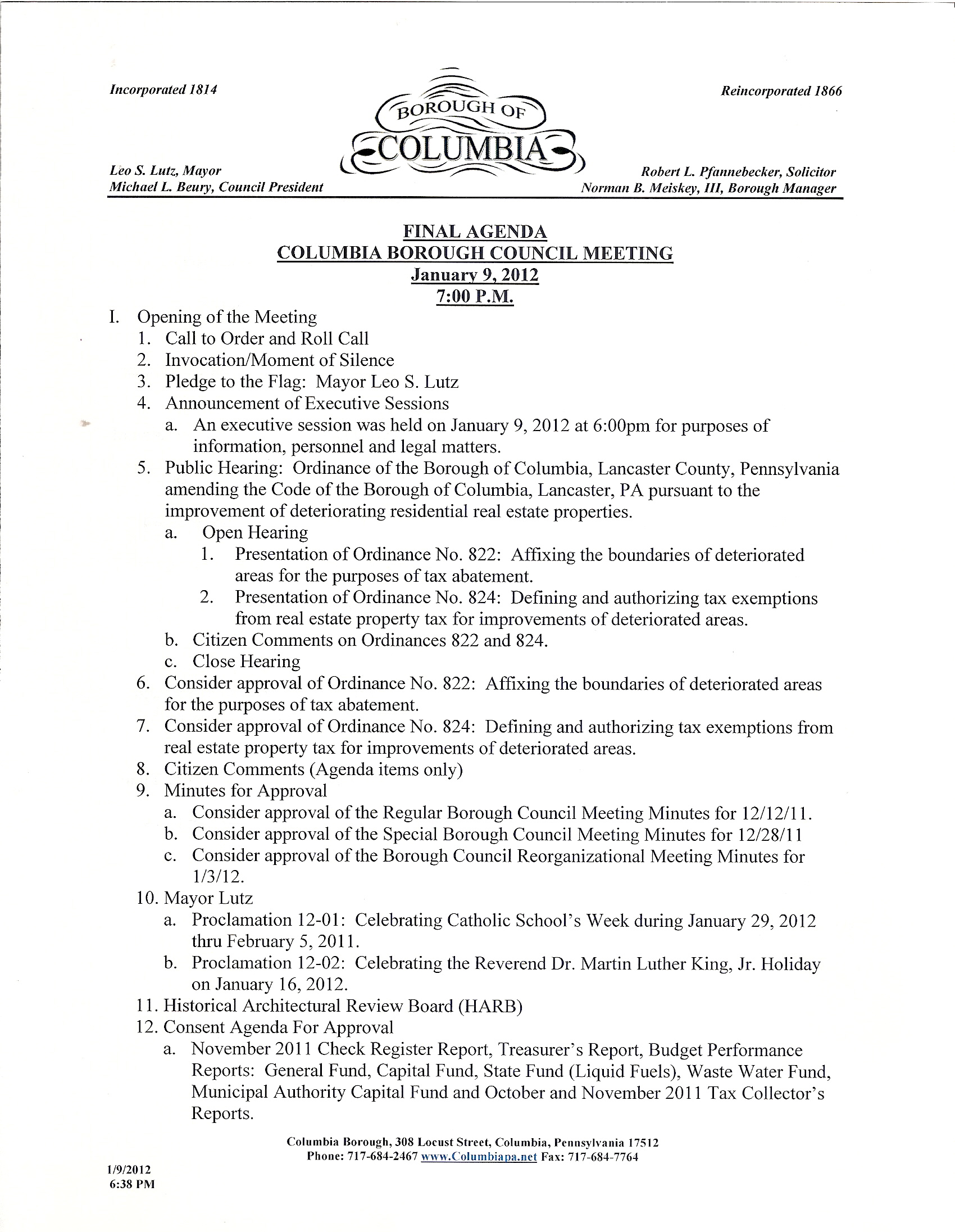 Newly elected Columbia Borough president Michael Beury brought the year’s first regularly scheduled council meeting to order last night at 7:00 pm in the Borough Hall Council chambers as all the councilors and some 15 citizens were in attendance.