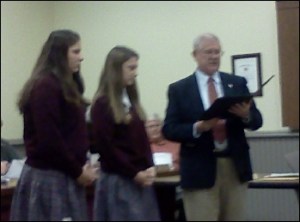 - Mayor proclaims “Celebrating Catholic Schools Week during January 29, 2012″ – At the Monday night Council Meeting Leo Lutz read a proclamation from the Borough. Tessa Katalinas, student council vice president, and Victoria Kraft, student council president, two students representing Our Lady of the Angels School were on hand to witness the reading and accept the citation. Accompanying the students to the meeting was second-grade teacher, Michelle Detz; she is the school’s coordinator for Catholic Schools Week, January 29 through February 4.