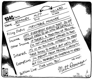 According to the IRS tax code example , “Mr. and Mrs. Brown are filing a joint return. Their Tax Table taxable income on Form 1040, line 43, is $25,300. First, they find the $25,300–25,350 taxable income line. Next, they find the column for married filing jointly and read down the column. The amount shown where the taxable income line and filing status column meet is $2,949.” Their effective tax rate is 11.6%. Many times over millionaire and presidential aspirant Mitt Romney announced that his tax rate is “closer to 15 percent than anything else” while his 2010 earnings included nearly $375,000 from speck-making and who knows how much from dividends and other earnings. Is this a great system or what?