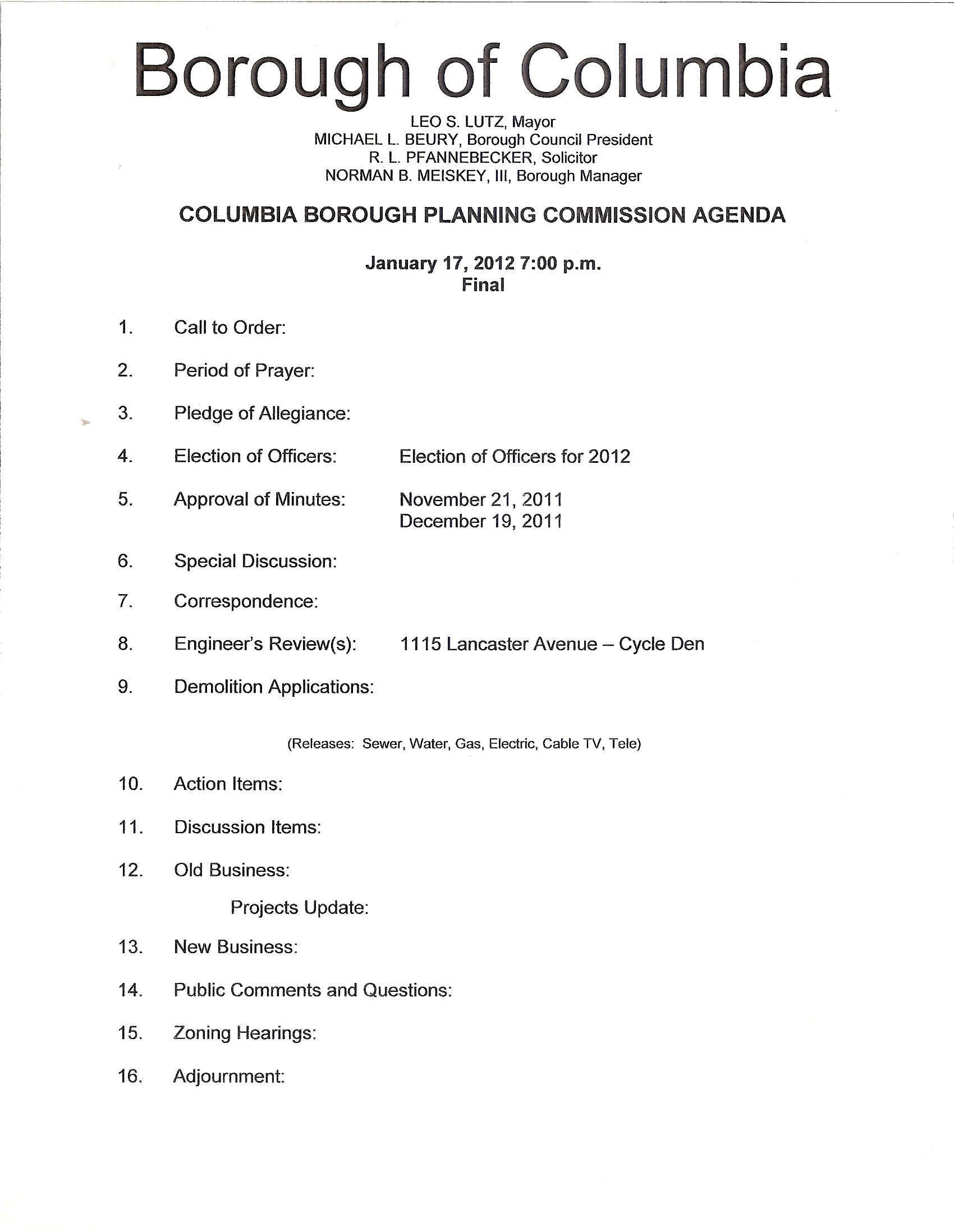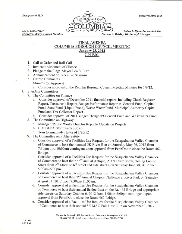Last week, the Columbia Borough Planning Commission held its first meeting of the year; the agenda for that meeting and a few notes follow below.