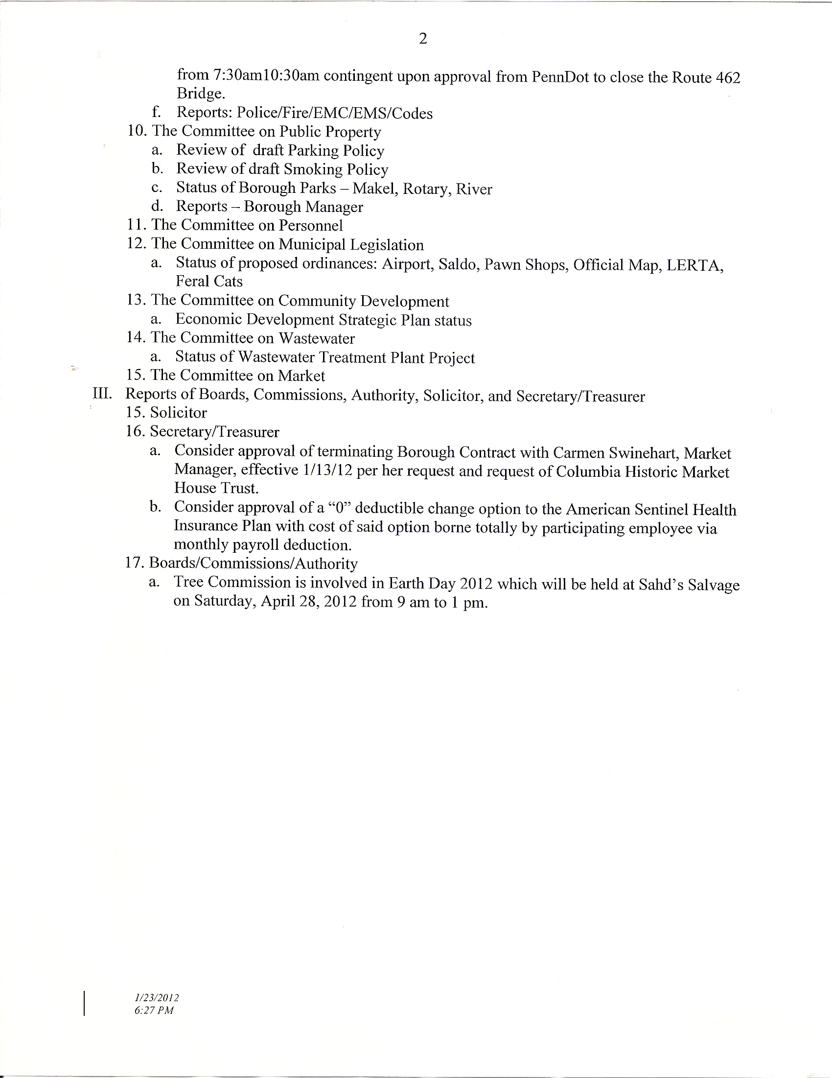 Each of the councilors held reporting sessions on the committees on which they head and/or sit: finance, highway, public safety, public property, personnel, municipal legislation, community development and wastewater. Since the Market House is no longer operated by the borough, there has been no market house committee designated for 2012, at this time.