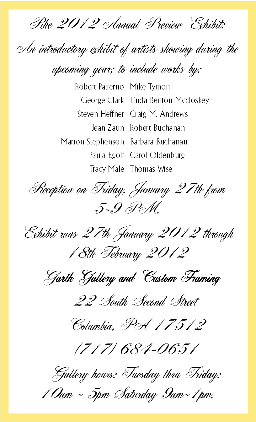 January 25, 2012January 25, 2012 17512 Columbia Garth Gallery invites you … www.garthgallery.net Share this: Click to share on Facebook (Opens in new window) Facebook Click to share on X (Opens in new window) X Like Loading... Related