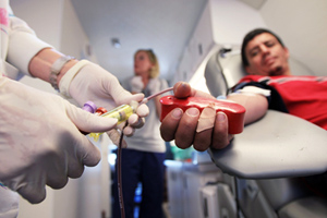 A California man donates blood at Providence Holy Cross Medical Center for victims of the Sept. 12 head-on collision between a Metrolink commuter train and a freight train in Chatsworth, Calif., on Sept. 14, 2008. (David McNew/Getty Images)