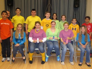 Students who qualified for the spelling bee are shown above; in the front row, left to right: Vincent Palmieri, McKenna Munoz, Tessa Katalinas, Jillian Kemmerly, Brynn Kelly and Crista Ricci. Shown standing in the back row are Kimberly Horst, Angelo Quiles, Walter Katalinas, George Reich, Kayla Rivera, Clare Steinfelt, Shawn Helton and Aj Smith.