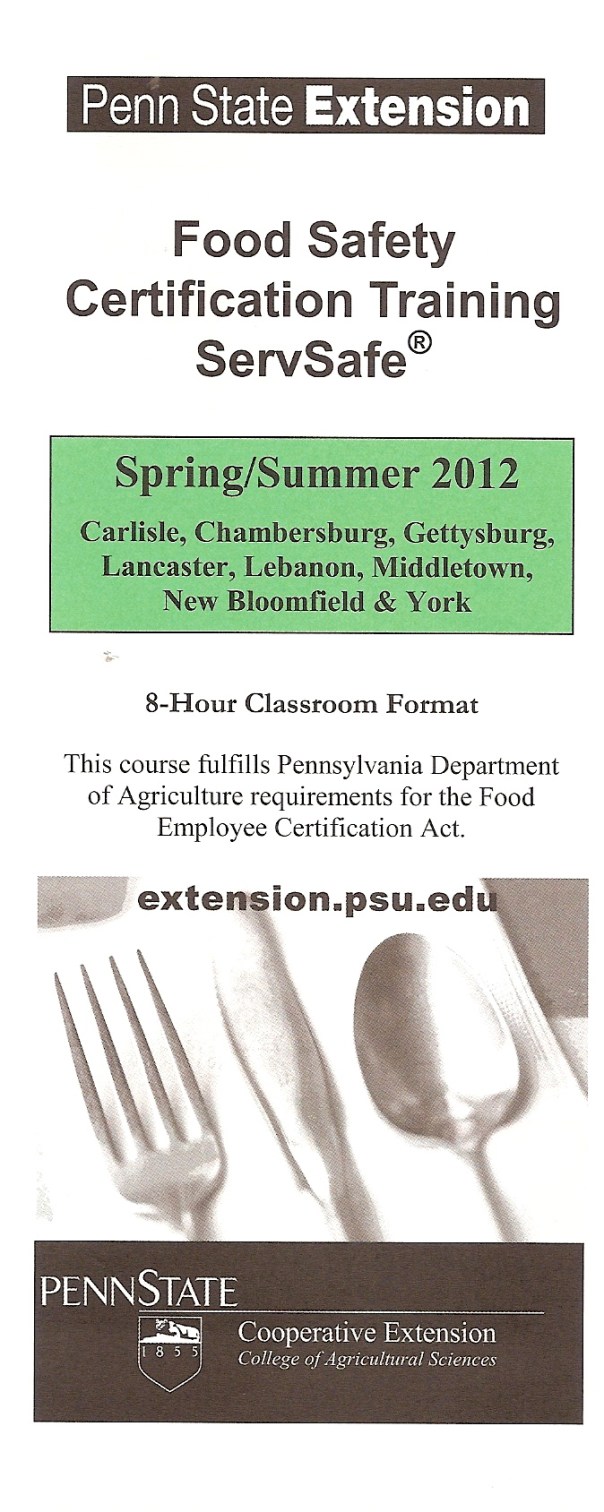 “At the end of the class, participants will take a proctored, multiple choice exam. A score of 75% or higher is required to receive the ServSafe® certificate which meets the Pennsylvania Department of Agriculture requirement for certification.