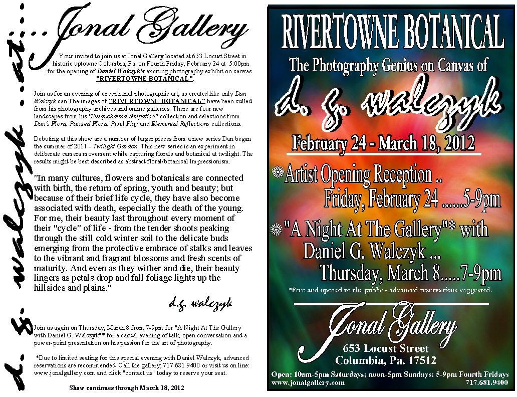 February 20, 2012February 20, 2012 17512 Columbia Rivertowne Botanical … photography genius on Fourth Friday at Jonal Gallery Share this: Click to share on Facebook (Opens in new window) Facebook Click to share on X (Opens in new window) X Like Loading... Related