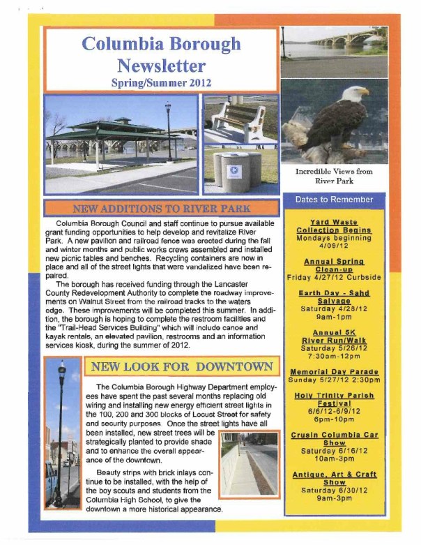 The 2012 Columbia Borough Newsletter is now available at the Borough Website; additionally, Columbia area households received the print version in yesterday’s Columbia edition of The Merchandiser.