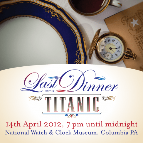 “This special event will take place April 14th 2012, from 7 PM until midnight. Take a journey back in time to an Edwardian world of strict class distinctions, obsession with etiquette and fashion and the era’s love of fine food. Now booking passage to attend ‘Last Dinner on the Titanic’ being held at the National Watch & Clock Museum, 514 Poplar Street, Columbia, Pennsylvania on the 100th anniversary of the RMS Titanic‘s maiden voyage.