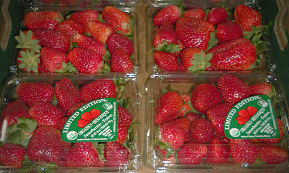 Spring is in the air. Everyone wants berries! And the Organic Strawberries from Mexico and Southern California are tasting great right now. Growers are fighting to keep up with the current demand which is high, but the Organic Strawberries you find at stores are likely to be firm, have good red color and pleasing flavor the next few weeks. Keep berries cold in the fridge but away from the blowing air, and only wash them just before use since water tends to speed up decay on the fruit.