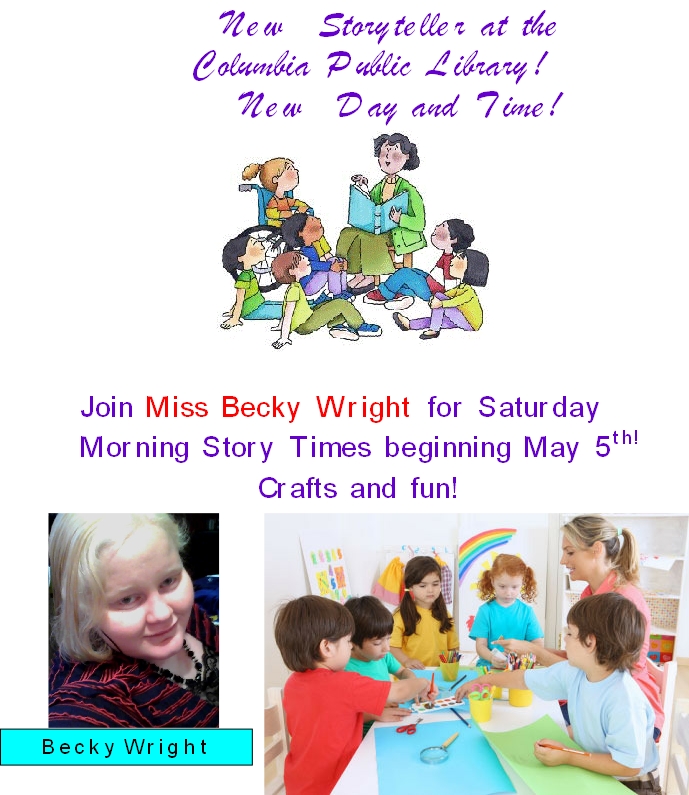 May 3, 2012May 3, 2012 17512 Columbia Saturday Morning Story Times begin this week Don’t miss Becky Wright’s first story time this Saturday at 10 AM! Topic: “The Crayon Box That Talked” and other stories about crayons … Share this: Click to share on Facebook (Opens in new window) Facebook Click to share on X (Opens in new window) X Like Loading... Related