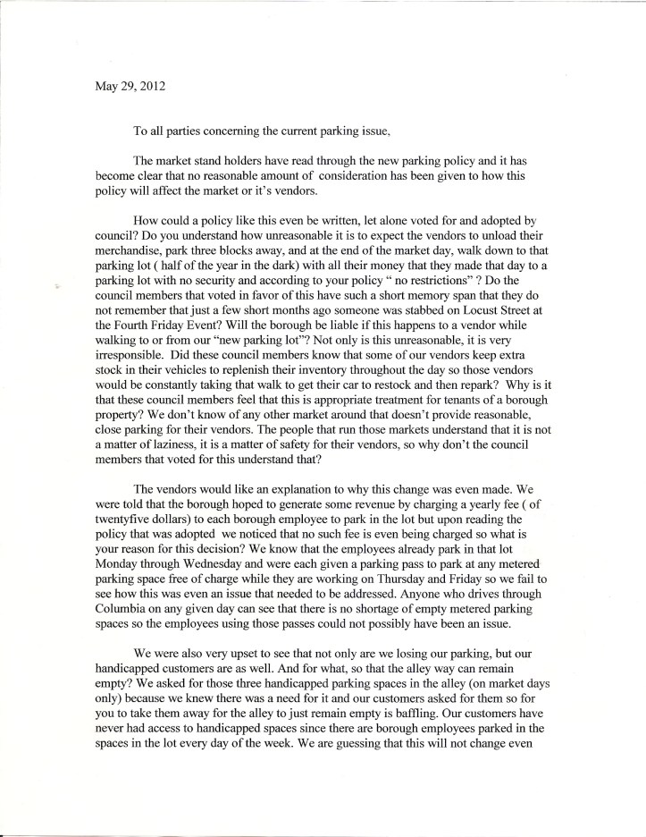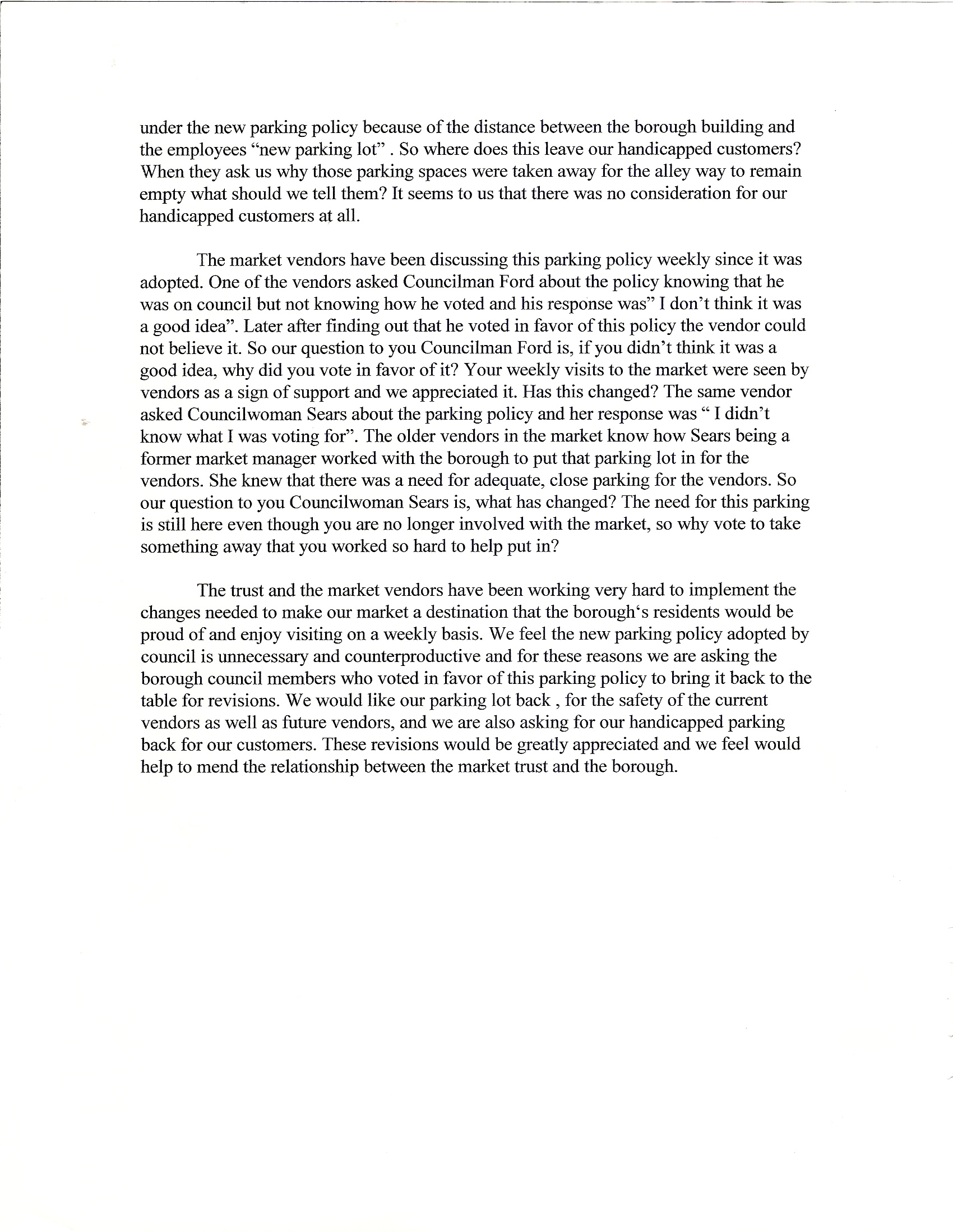 She prefaced her commentary by saying that what she was going to read was drafted by and with the other market stand holders; the statement appears here.