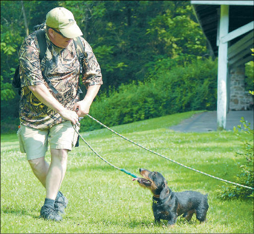 P.J. Reilly/Sunday News Kevin Lutz, of Columbia, works with his blood-tracking, wire-haired dachshund named Archie von Tierspur.