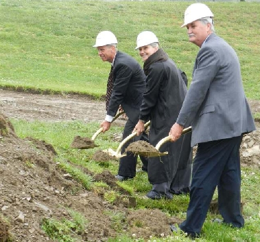 Lancaster General Health and Columbia Borough School District officials (from left) Tom Strickler, school board president; Alice Yoder, director of community health at LGH and Superintendent Barry Clippinger broke ground last week on a new outdoor exercise system. (Bill Clark) – [SOURCE- MyColumbiaNews]