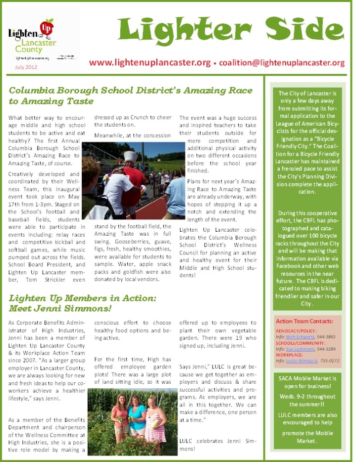 “In partnership with Lancaster General Health, the Lighten Up Lancaster County Coalition was formed in 2007 with the goal of increasing the percentage of adults and children who are at a healthy weight in Lancaster County.