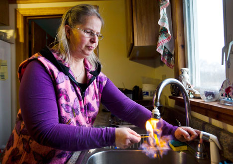‘Sherry Vargson, who leased the mineral rights under her Pennsylvania farm to an energy company, demonstrates that methane has leached into her well water by lighting the water on fire as it pours from her kitchen sink. Hydraulic fracturing, also known as fracking, has left some of the water in northeastern Pennsylvania nonpotable, forcing many residents to rely on outside water distribution.” [Photo by Jim Lo Scalzo / Landov]