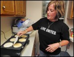 Wheatland Federal Credit Union CEO Kathy Rye flips pancakes at Trinity House Apartments in Columbia. Wheatland Federal employees cooked pancakes for the residents of the Apartments as part of United Way’s Day of Caring. (SOURCE: Lancaster Intelligencer Journal/New Era, Blaine Shahan / Staff)