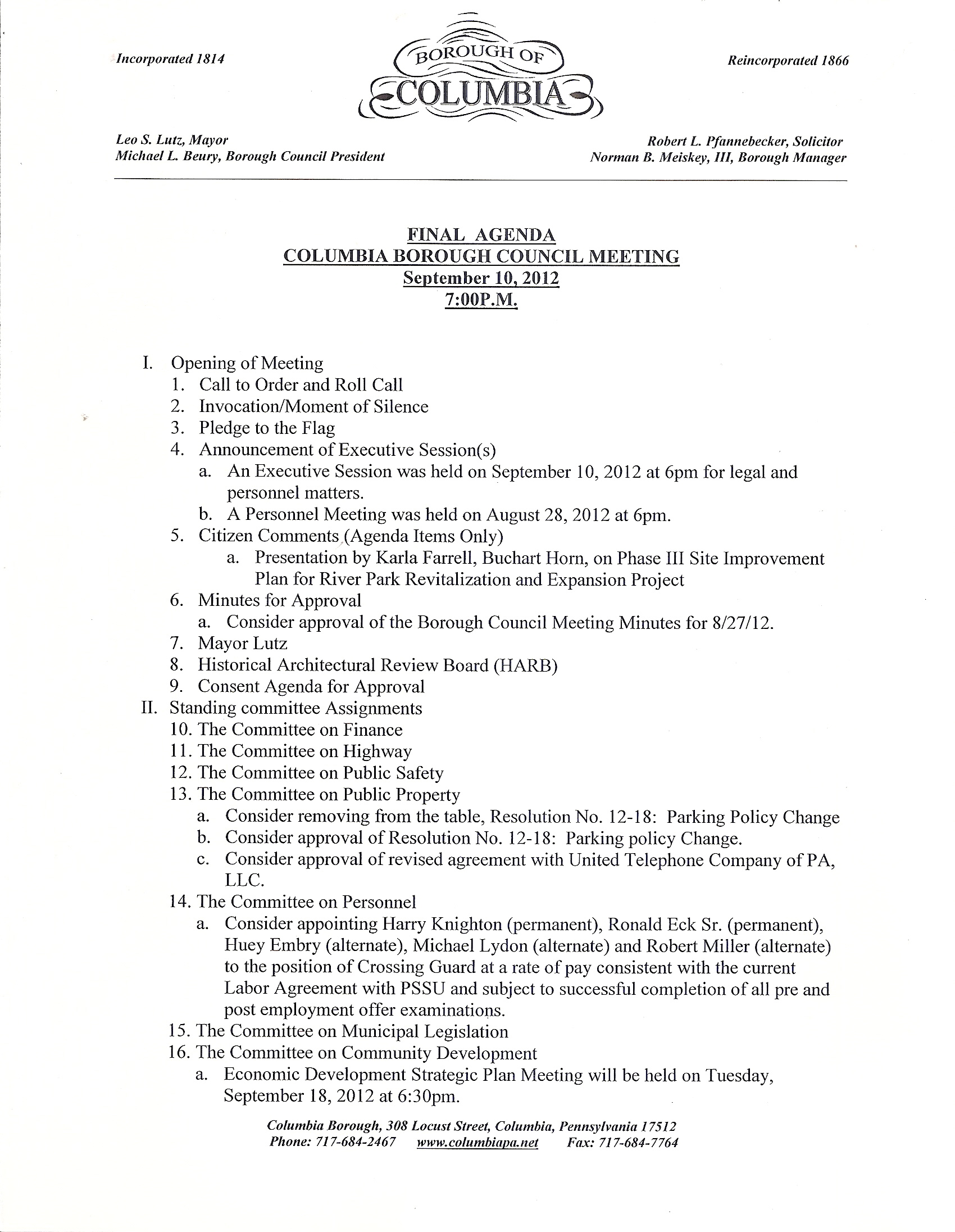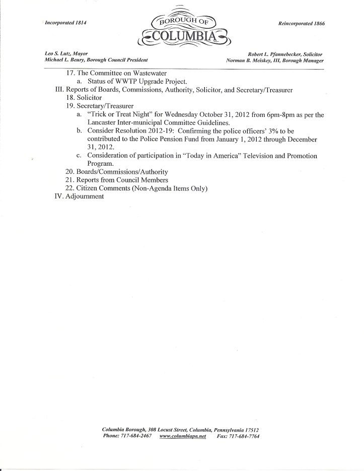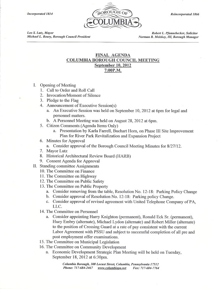The September 2012 Columbia Borough Council meeting was held last night in the borough hall conference room; council president Michael Beury called the meeting to order at 7:00 pm. An audience of just over a half-dozen persons was in attendance as the meeting was conducted.