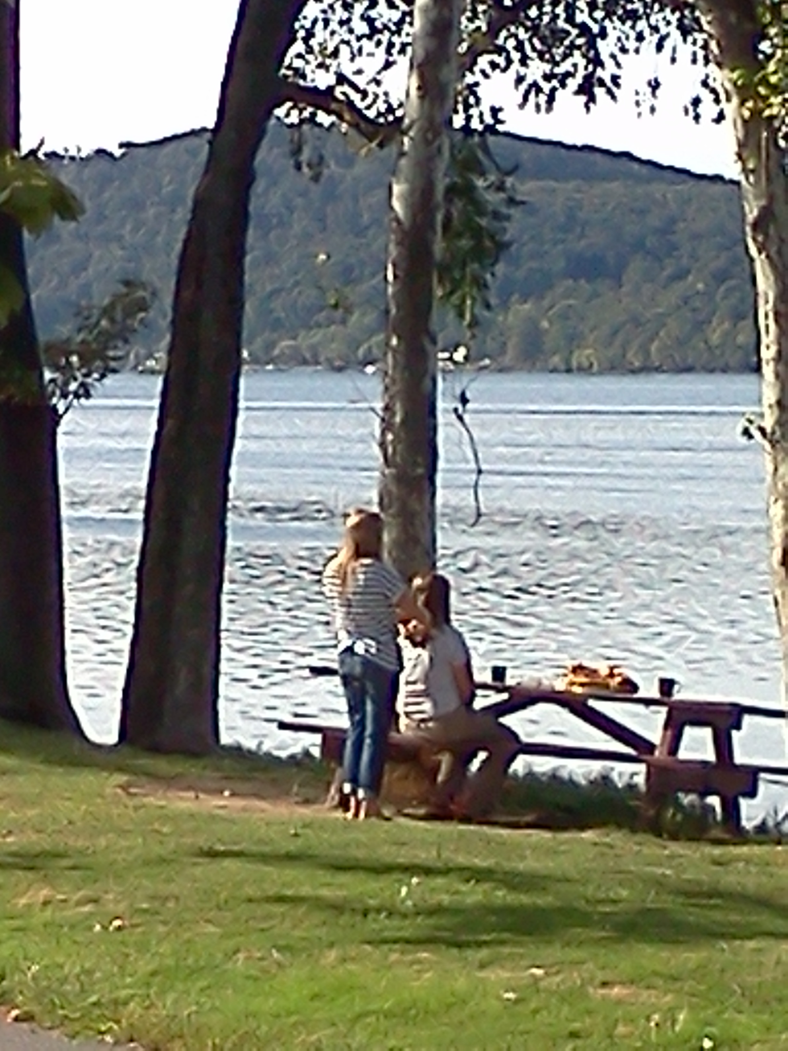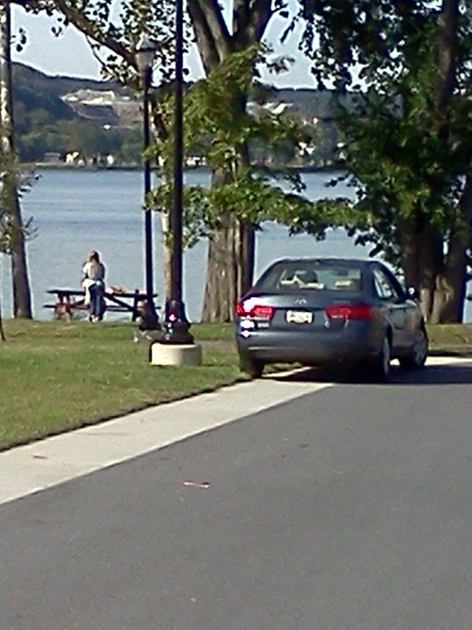 Was the guy in the car parked on the grass watching the hair-cutting session by the river? Is it legal to park on the grass when at least a dozen designated parking spaces were vacant?