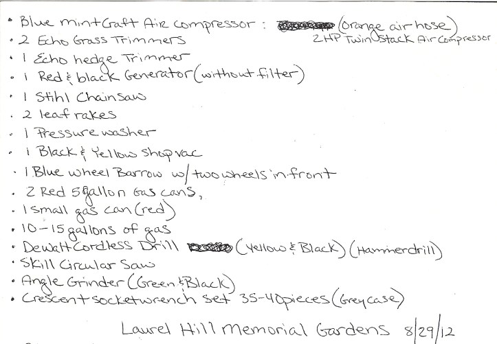 When Columbia news, views & reviews spoke with Schmitt, the property manager of Laurel Hill Cemetery, he claimed that his grounds keeping supervisors did just that. In an interview yesterday, Schmidt and his staff told us that the most recent incident of theft is “not the first” one at Laurel Hill Cemetery. Over the night in late August, someone cut the lock on the secured facility and made off with the items on the above list.