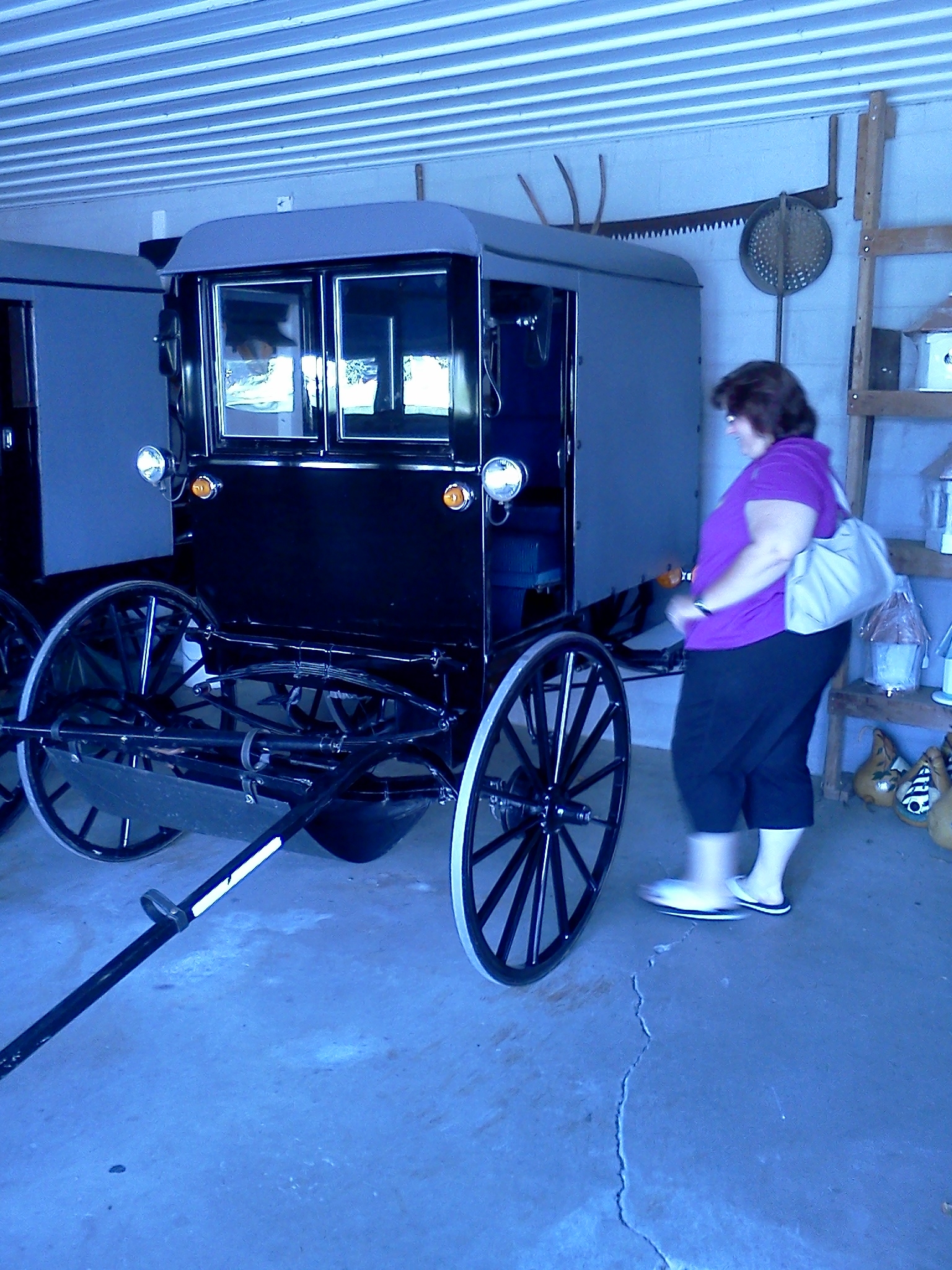 Tour guide Bonnie described how at age 16, a boy gets his first buggy, which has one seat. The gray buggy is used for farm transport. A buggy has close quarters and most people used to the comfort of a car would find it difficult to fit in, crawl over the front seat to get to the back seat.