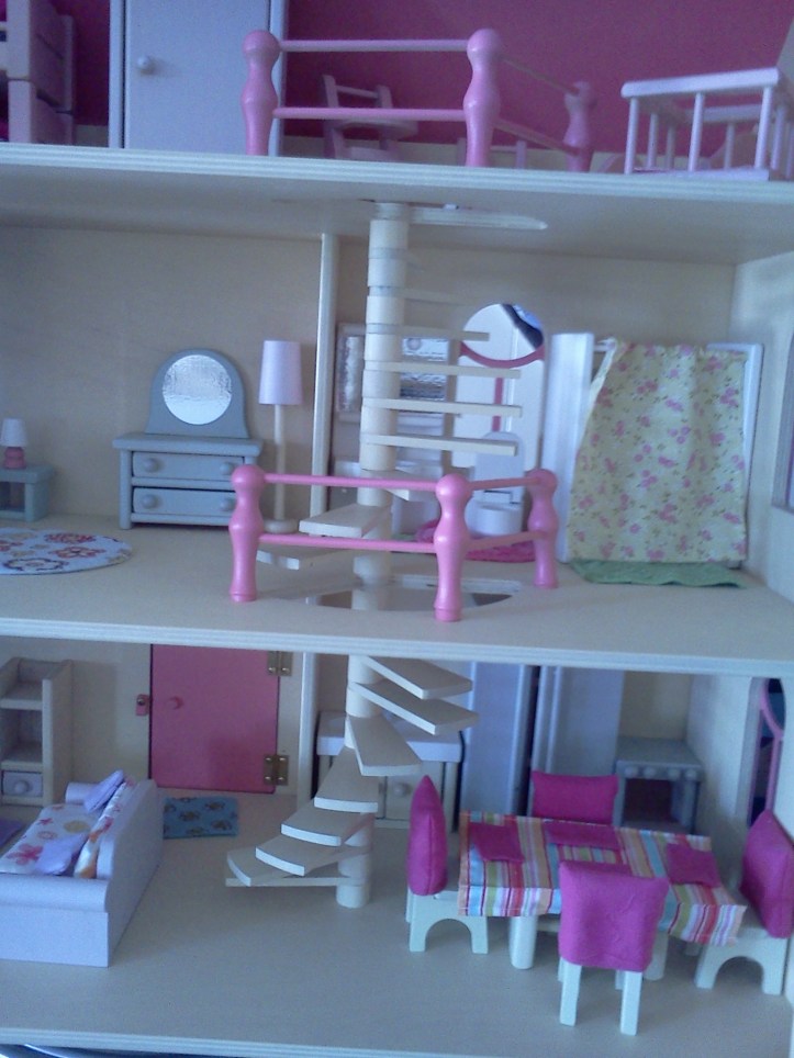 This wooden dollhouse with colorful hand-crafted furniture will delight girls of all ages.