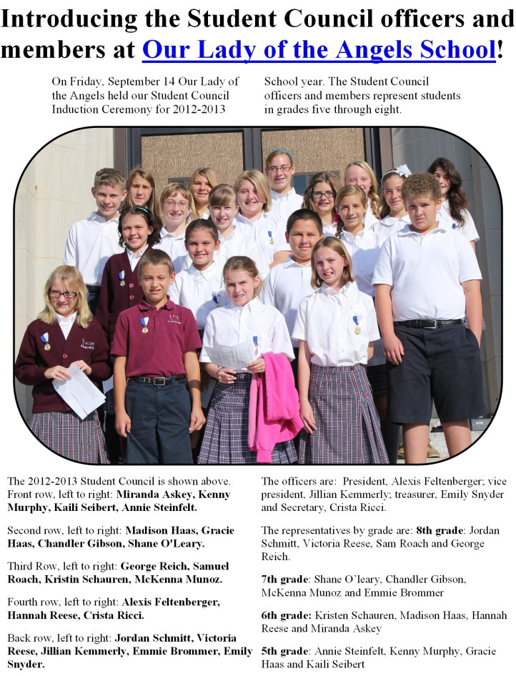 “The Student Council of Our Lady of the Angels Catholic School will fulfill the important responsibility of providing a quality student government for the school. It will promote the following qualities in it members – Citizenship, Scholarship, Leadership, Human Values, and Love of God.